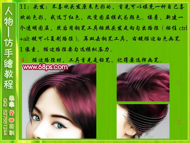 11、头发处理:首先可以填充一种自己喜欢的色彩,我选了红色,改变图层模式为颜色。接着,新建一个透明图层,用钢笔工具按照头发走向勾出路径,按Ctrl