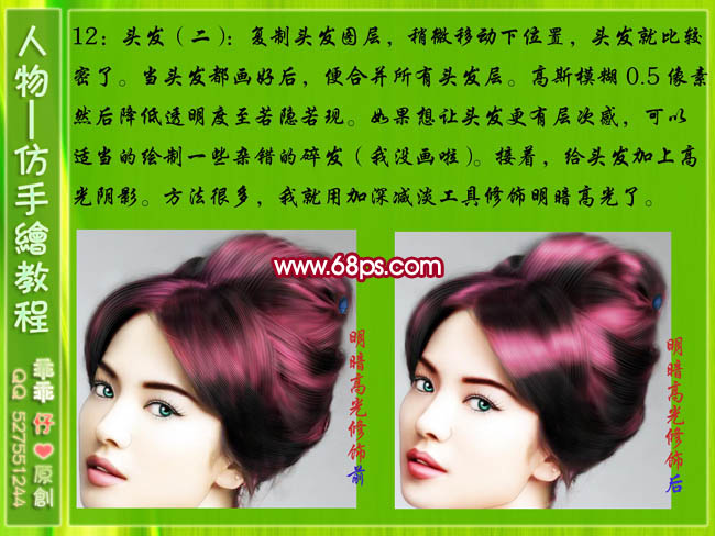 12、复制头发图层,稍微移动下位置,头发就比较密了。当头发都画好后,便合并所有发层。高斯模糊0.5像素,然后降低透明度至若隐若现。如果想让头发更有层次感,可以适当的绘制一些杂乱的碎发。接着给头发加上光影。