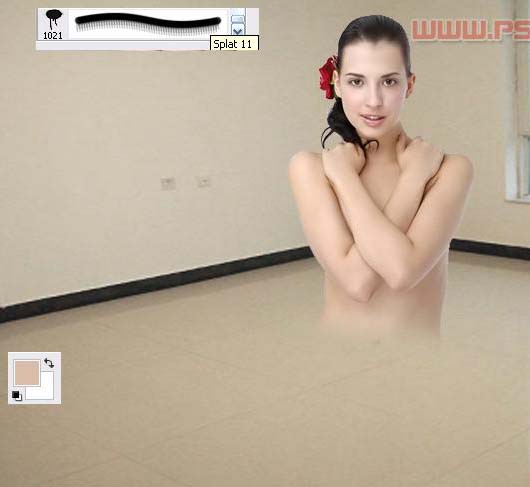 3、将前景色设为人物肤色(吸管选中人物最下端皮肤颜色即可),同时载入下载的流溅画笔(可以去网上下载类似的笔刷),选择1021号画笔。