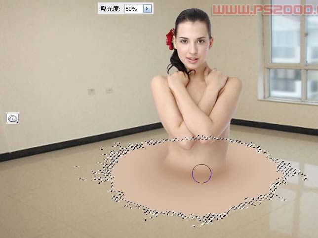6、选中加深工具,上方选项中的曝光度设为50%左右,围绕人物最下端处加深。