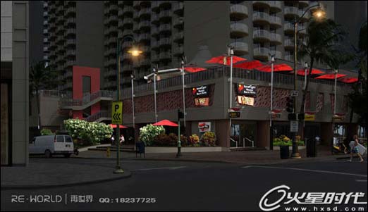 6、好了,继续,现在处理第一层商铺的功能性照明,我采用的是天花顶灯。这种灯有很好的照度,照出来的光比较均匀,光型也很好看。对于这种从上往下打的光,我采用的是PS里的光照效果滤镜。