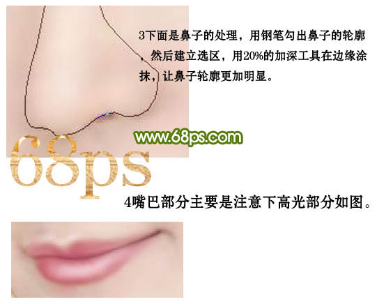 3、鼻子的处理,用钢笔工具勾出鼻子的轮廓,然后新建选区,用20%的加深工具在边缘涂抹,让鼻子轮廓更加明显。