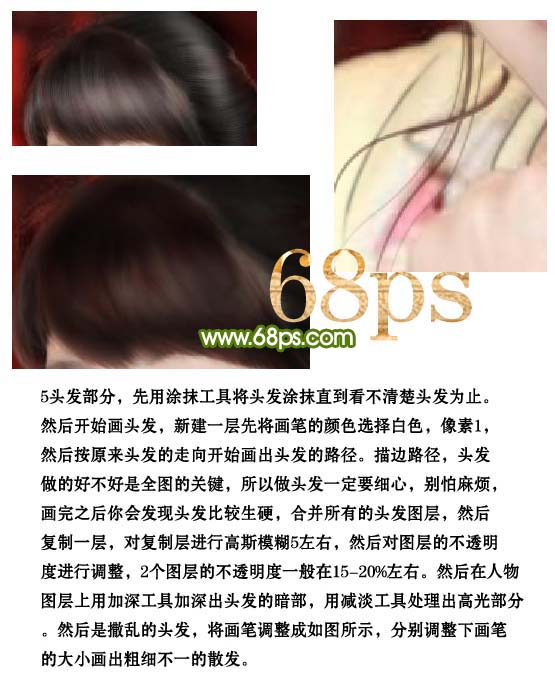 5、头发部分,先用涂抹工具将头发涂抹直到看不清楚头发位置。然后开始画头发,新建一层先把画笔的颜色设置为白色,像素1,然后按原来头发的走向开始画出头发的路径,再描边路径,头发做的好不好是全图的关键,所以做头发一定要细心,别怕麻烦,画完之后你会发现头发比较生硬,合并所有的头发图层,然后复制一层,对复制层进行高斯模糊5左右,然后对图层的不透明度进行调整,2个图层的不透明度一般在15-20%左右。然后在人物图层上用加深工具加深出头发的暗部,用减淡工具处理出高光部分。然后是散乱的头发,将画笔调整成如图所示,分别调整下画笔的大小画出粗细不一的散发。