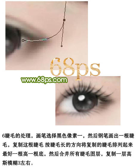 6、睫毛的处理,画笔选择黑色像素1,然后用钢笔工具画出一根睫毛,复制这跟睫毛,按睫毛长的方向将复制的睫毛排列起来,最好一根高一根低,然后合并所有睫毛图层,复制一层高斯模糊3左右。