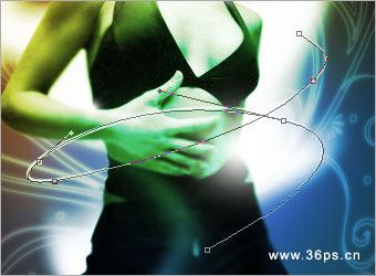 10、为美女添加环绕光圈:使用钢笔工具,在美女腰周围随便画一些线条,记得使用路径形式的钢笔。画好后,点击画笔,选择一个3像素的画笔。将前景色设置为白色。新建一个图层,右键点击钢笔工具刚才画的路径,选择描边途径,点击画笔。点选模拟钢笔压力。