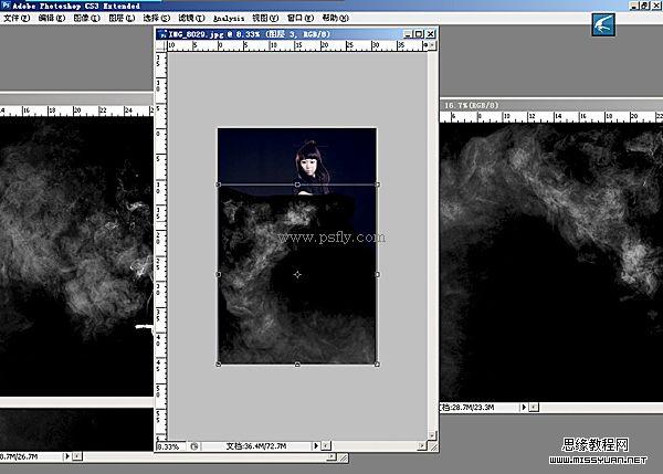 15、拖入理想的烟雾形状到画面,并调整烟雾适合的大小。