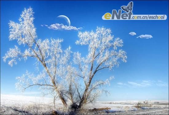 第六步:如上图所示,“天空”显得有些太“空”了,我们来为它添加一些云朵。打开素材图片【云】,选择几朵云彩,然后将其粘贴到【月之仙境】中,效果如下图所示。(林栖者语:原文中此处没有详细的步骤。我简单说一下我的做法,仅供大家参考。首先是使用【魔棒工具】或者【快速选择工具】在一朵云彩上点击,将其选中,为了使选区不是太生硬,可以进行1至2像素的羽化,然后按【Ctrl+C】键复制,在【月之仙境】中按【Ctrl+V】键粘贴。然后按【Ctrl+T】键,调整图层的位置及大小。为了让云朵和天空融合的更好,可以适当降低图层的不透明度。重复上面的操作,添加其它的云彩,直到得到满意的效果。)