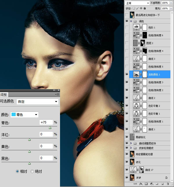 16、运用可取颜色调整层分别对青色和蓝色进行调整。