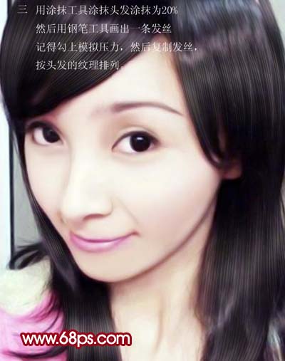 3、用涂抹工具压力为:20%左右,涂抹人物头发,然后用钢笔工具画出一条发丝选择画笔描边记得勾选模拟压力,然后复制发丝按头发的纹理排列。