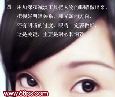 4、用加深和减淡工具把人物的眼睛轮调好,把握好敏感度及光源的方向,还有明度的过度。
