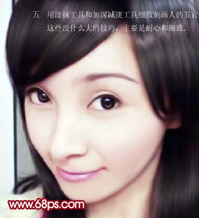 5、用涂抹工具和加深/减淡工具细致的刻画人物的五官。这些没有什么大的技巧,主要是耐心和细致。