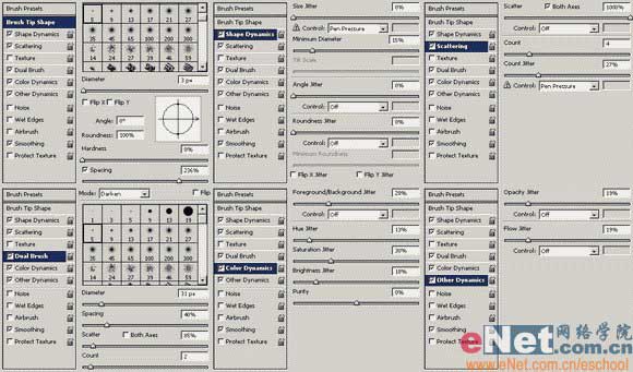 6.现在再照下图所示设置下画笔笔触。然后将前景色和背景色设置为#ff0000 和 #0024ff。再建立一个新图层用刚设置好的画笔进行描边。(描边设置同步骤四)如下图所示: