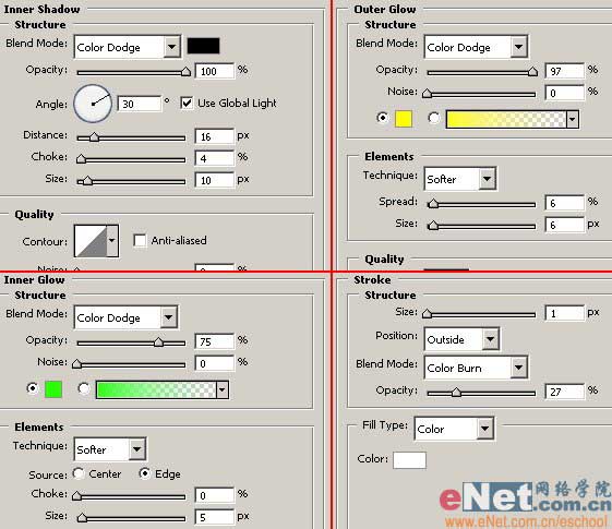 7.再给以上图层加入图层样式,分别为内阴影,内发光,外发光,描边,设置如下图所示: