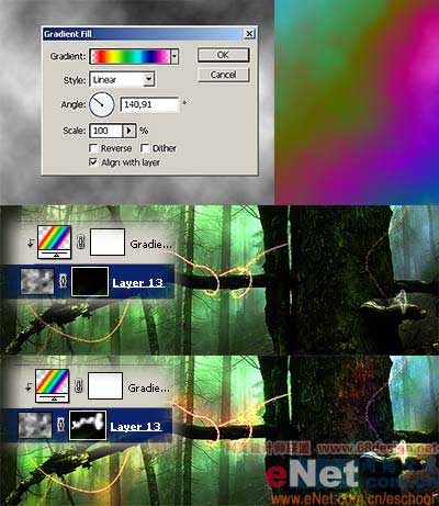 9.到这里整个照片的编辑已经进入尾声了,接下来我们还需要修饰一些细节部分,再处理加入一些光线。建立一新图层,设置前景色和背景色分别为白色和黑色。然后执行滤镜-渲染-云彩,然后用步骤二那样加入一个渐变填充调整层,渐变色还是用彩虹渐变色。在云彩图层上添加一个图层蒙版,在蒙版中填充黑色并将云彩图层的混合模式设置为颜色减淡(Color Dodge)。现在再将前景色设置为白色在云彩层的图层蒙版中用白色的画笔涂出我们需要的部分颜色,如下图所示: