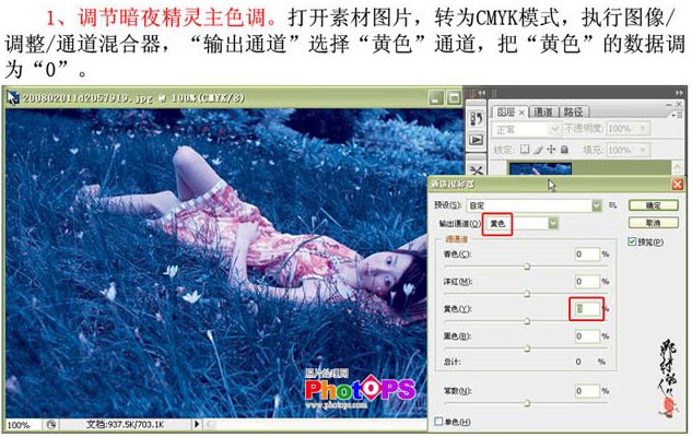 1.调节暗夜精灵主色调。打开原图,转为CMYK模式,执行图像 > 调整 > 通道混合器。“输出通道”选择“黄色”通道,把“黄色”的数据调整为0