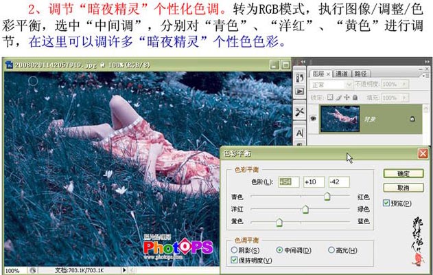 2.调节暗夜精灵个性化色调。转为RGB模式,执行图像 > 调整 > 色彩平衡,选中“中间调”,分别对“青色”、“洋红”、“黄色”进行调节