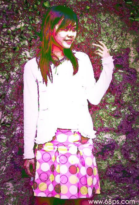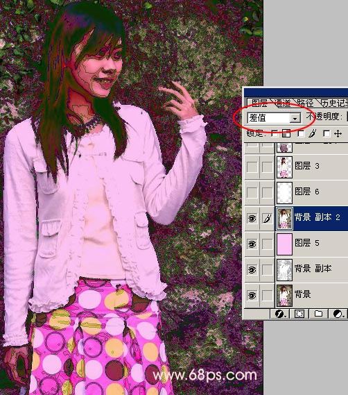 3.把背景图层复制一份,然后移到最上面的图层如图4所示把图层混合模式改为“差值”,有点效果出来了,人物比较难看,不过不要紧张。要与众不同就是要学会从另类的地方出发,这样才能突破传统。