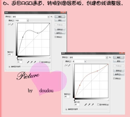 6、返回RGB通道,转换到图层面板,创建曲线调整图层,对RGB及红色通道进行调整,参数设置如下图。