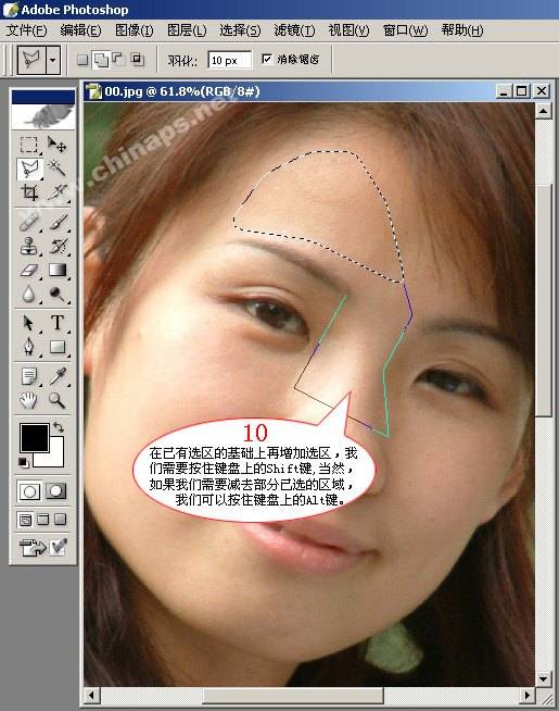 10、在已有选区的基础上再增加选区,我们需要按住键盘上的Shift键,当然如果我们需要减去部分已选的区域,我们可以按住键盘上的Alt