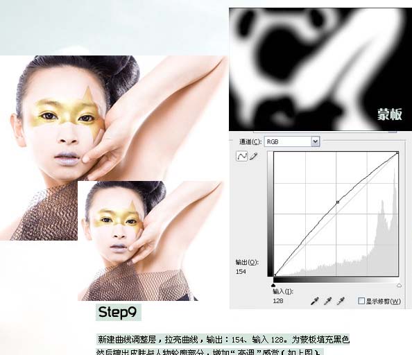 9、创建曲线调整图层,拉亮曲线,参数设置如下图,确定后把蒙版填充黑色,用白色画笔擦出皮肤与人物轮廓部分,增加“亮调”感觉。