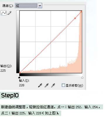 10、新建曲线调整图层,轻微拉低红通道。点1输出252,输入:254,点2输出:225,输入:228,如下图。