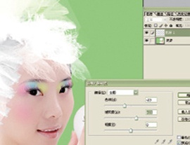21、新建图层,在人物颧骨处做选区,并适当羽化,执行色相/