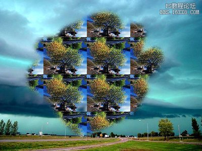 此外,更改仿制图章的绘图模式〖SHIFT +/SHIFT -〗,所复制出来的图像效果也会产生改变,原理等同于图层混合模式的改变。如下图,将绿树分别以颜色减淡和亮度方式复制,得到了不同的效果。