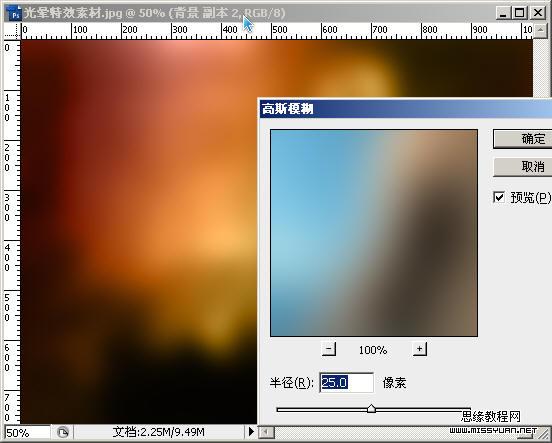六、复制“背景”图层得到“背景副本2”,把它拖动到“图层1”和“背景副本”之间。对“背景副本2”执行“高斯模糊”滤镜,设置模糊半径为25像素并确定。