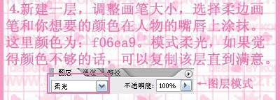 4、新建一个图层,调整画笔大小,选择柔边画笔和你想要的颜色:#f06ea9,再人物的嘴唇上涂抹,给人物加上口红,涂好后吧图层混合模式改为“柔光”。如果觉得颜色不够的话可以复制该层知道自己满意为止。