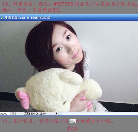 10、新建一个图层用颜色:#f977b5的画笔在人物脸部边缘涂抹,然后把图层混合模式改为“颜色”,图层不透明度改为:50%。