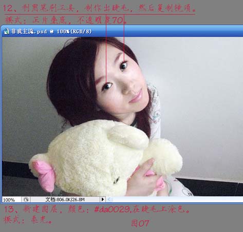 13、新建一个图层,用颜色:#da0029的画笔在人物睫毛上涂抹,再把图层混合模式改为“柔光”。