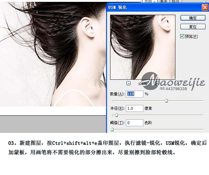 + Shift + Alt + E盖印图层,执行:滤镜 > 锐化 > USM锐化,确定后加上图层蒙版,用画笔将不需要锐化的部分擦出来,尽量别擦到脸部的轮廓线。