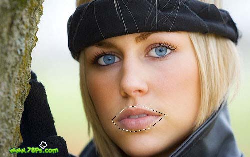 2、之后,我认为我们应该添加一些口红在嘴唇上。用套索工具(或者钢笔工具,磁性套索工具)把嘴唇圈起来。