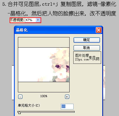 5、合并可见图层,按Ctrl + J 复制一层。执行:滤镜 > 像素化 > 晶格化。确定后加上图层蒙版,用黑色画笔把人物脸部擦出来,图层不透明度改为:47%。