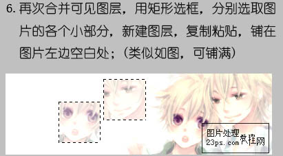 6、再次合并可见图层,用矩形选框分别选区图片的各个小部分,新建图层复制粘贴。铺在图片左边空白处,如下图。