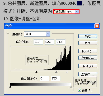 9、合并图层。新建一个图层填充颜色:#000040,图层混合模式改为“排除”,不透明度改为:35%。