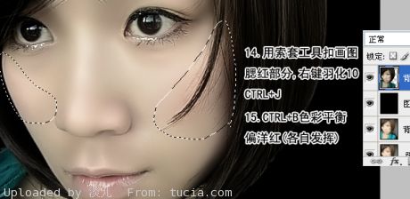 14、用套索工具扣画腮红部分,右键羽化10个像素,按Ctrl
