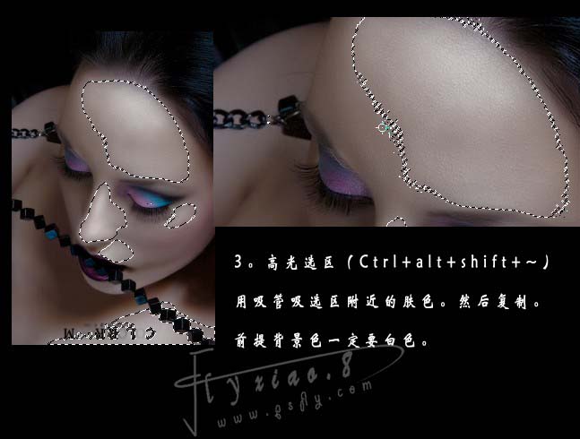+ Alt + ~调出高光选区,然后复制出来(前提是背景色一定要白色),用吸管吸选区附近的肤色。