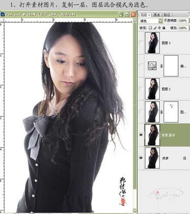 1、打开原图素材,把背景图层复制一层,图层混合模式改为“滤色”。