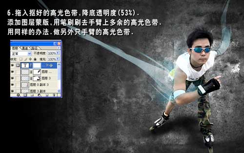 6、拖入刚才勾好的彩带,把图层不透明度改为:53%,加上图层蒙版,用黑色画笔擦掉手臂上多余的高光彩带。用同样的办法做另外一只手臂的高光彩带。