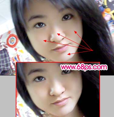 6、选择减淡工具,曝光度为:10%左右,在人物脸上有反光的地方涂抹,适当加大肤色的质感,大致效果如图7。
