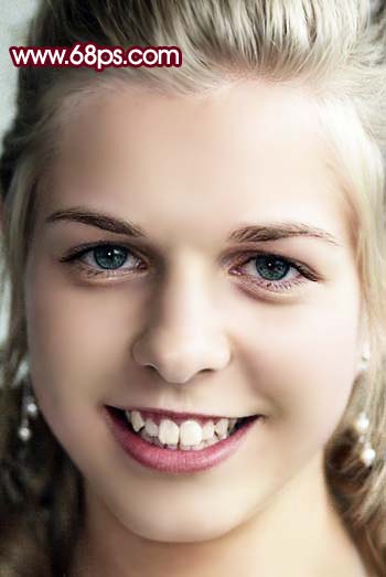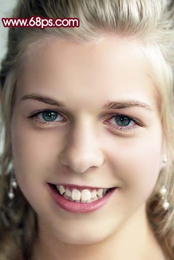 6、新建一个图层,盖印图层,选择涂抹工具,把人物头发及牙齿部分的杂色涂掉,效果如图7。