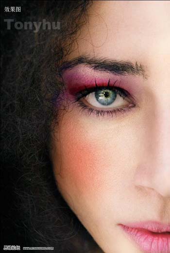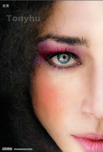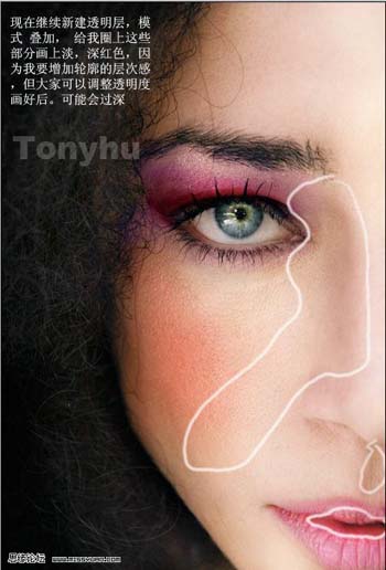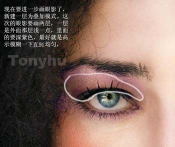 12、这一步画眼影,新建一个图层,图层混合模式改为“叠加”,这次的眼影要画两层,一层是外面那层浅一点,里面要深紫色,最好是高斯模糊一下。