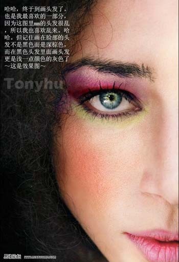 18、终于到了头发了,记住画在脸部的头发不是黑色的而是深褐色。而在黑色头发里面画头发更是浅一点颜色的灰色了。