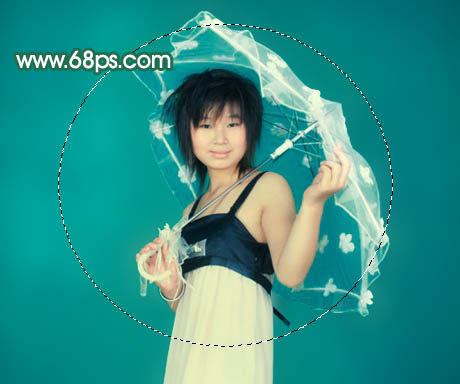 5、在盖印图层上面新建一个图层,用椭圆选框工具拉出图8所示的选区,按Ctrl + Alt + D 羽化50个像素后填充颜色:#00CAC0,效果如图9。