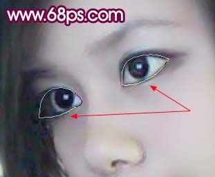 7、这一步主要处理眼睛部位,先用钢笔工具抠出眼睛的轮廓如图7,转为选区后先用模糊工具,压力为:20%左右,把边缘部分模糊处理,然后再用加深工具加深边缘,确定后用减淡工具把图7箭头所示位置涂亮一点,大致效果如图8。