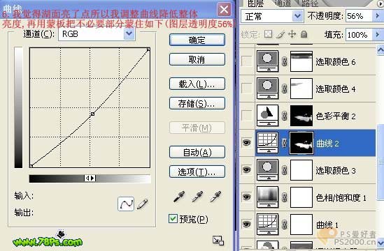 6、执行图层 > 新建调整图层 > 曲线调整图层,参数设置如下图,然后用黑色画笔把除湖面以外部分擦掉。