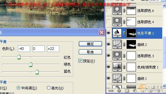 7、执行图层 > 新建调整图层 > 色彩平衡调整图层,参数设置如下图,确定后用黑色画笔把除湖面以外部分擦掉。