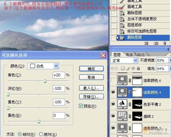 9、为了让整个图更有层次,执行图层 > 新建调整图层 > 可选颜色调整图层,参数设置如下图,确定后用黑色画笔把天空部分擦出来。