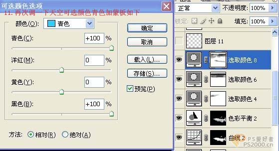 10、再次执行图层 > 新建调整图层 > 可选颜色调整图层,参数设置如下图,确定后用黑色画笔把天空部分擦出来。
